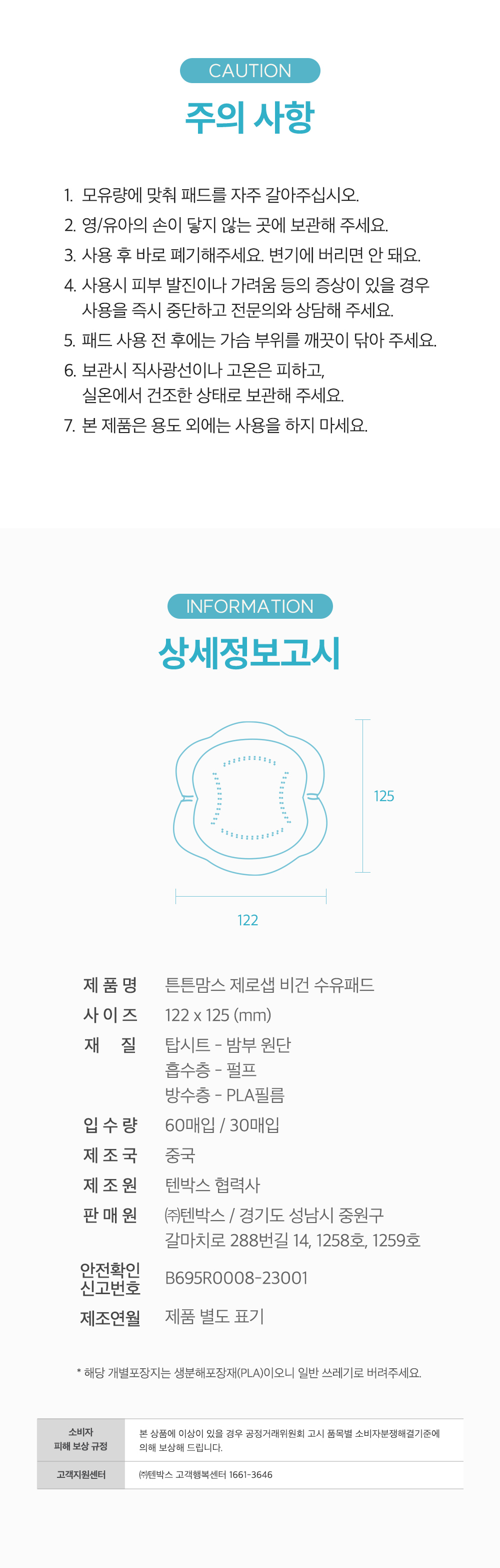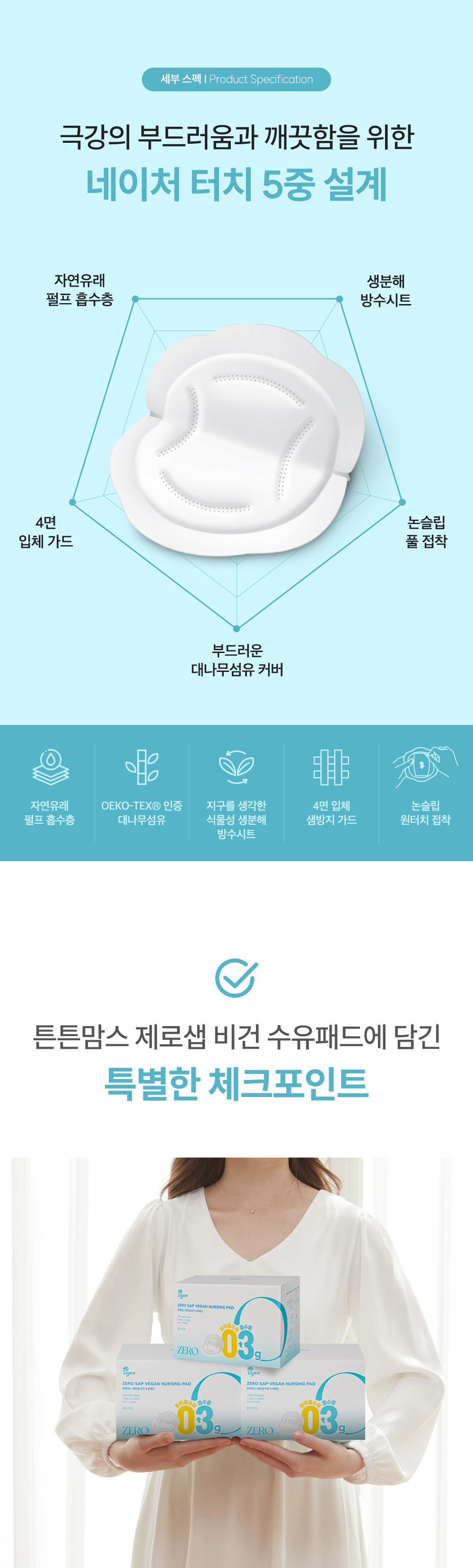 | 품명 및 모델명 | 튼튼맘스 제로샙 비건 프리미엄 수유패드 30매/60매 | ||